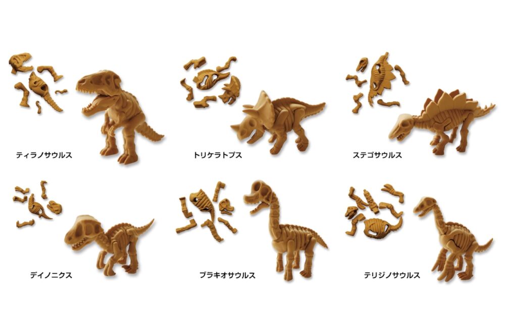 全6種+レアカラーの消しゴムがクローズドパッケージでランダムに入っている。ホームページでは、正確な骨格図を使って芝原暁彦博士の解説付きで恐竜の知識を学ぶことができる。