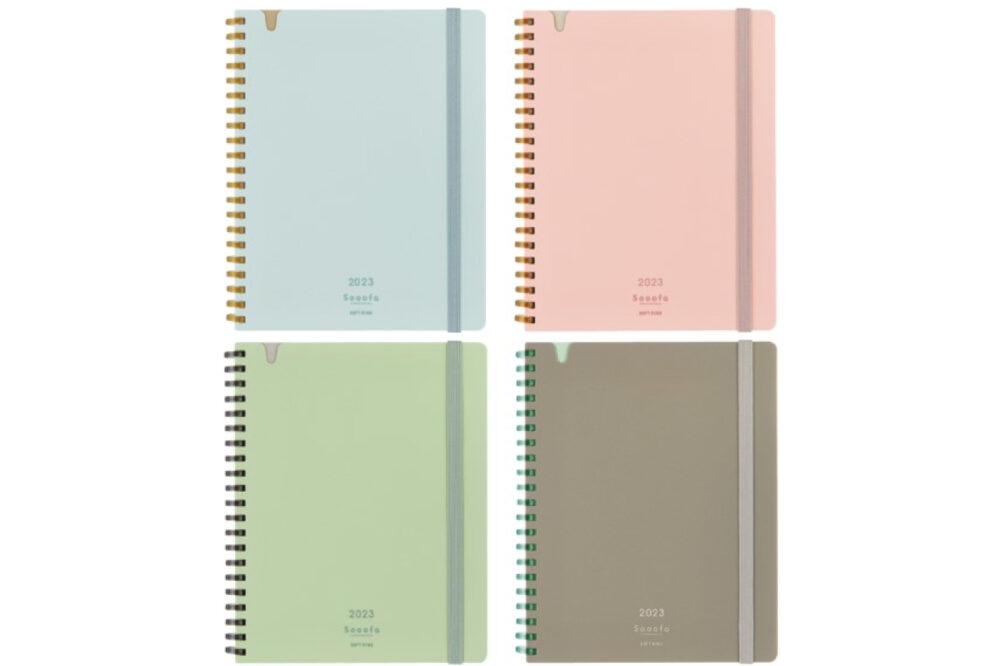 ON、OFFのシーンを選ばず使えるデザインと表紙のPP素材や、表紙がとじられるゴムバンドが実現する携帯性、やわらかリングの使い心地などが好評のソフトリングノートSooofaシリーズのダイアリー。