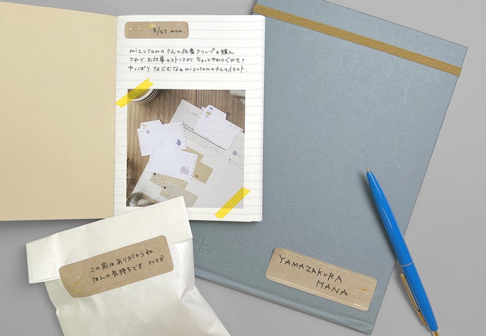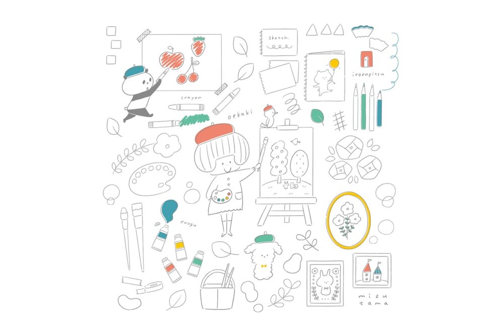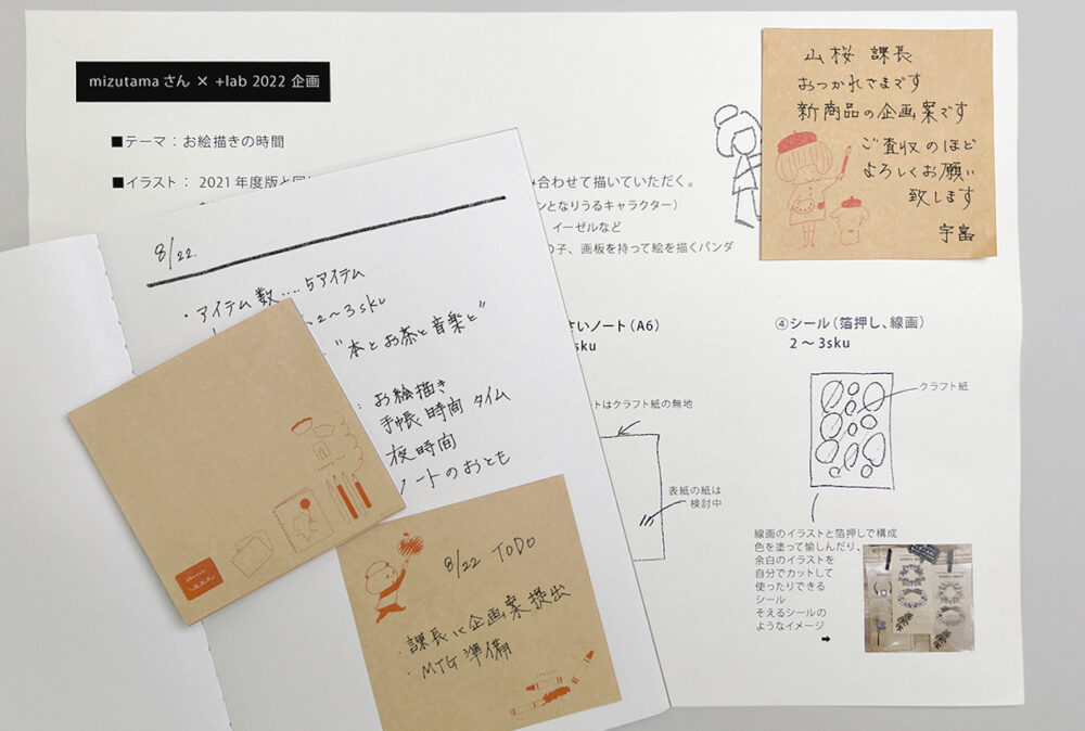 テーマは「お絵描きの時間」。ノートやメモや付箋など、いつもの文具をいつものように使うのはもちろん、mizutama氏のイラストとクラフト紙を活かした使い方、手帳デコやコラージュなどにおすすめの全5アイテム(13sku)が揃っている。