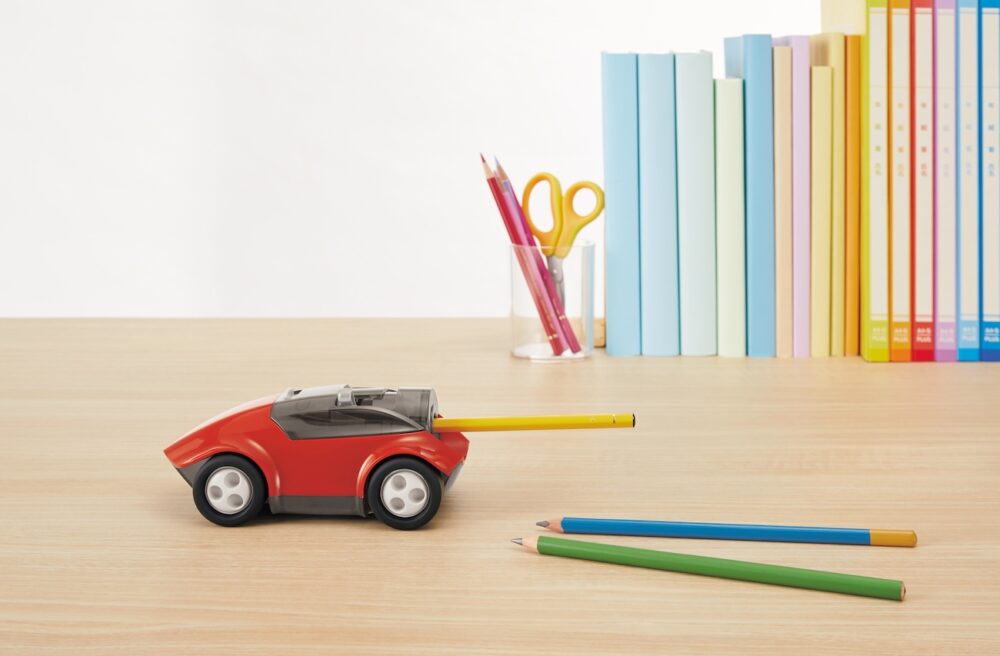 「ハシレ!エンピツケズリ!」は、鉛筆を差し込み、腕、肩、体重を使って車を動かすだけで、楽しく軽く、子どもでも簡単に鉛筆を削ることができる。鉛筆を削る行為そのものに楽しさを取り入れることで、勉強のポジティブなサポートになる、これまでにない新しい鉛筆削りだ。