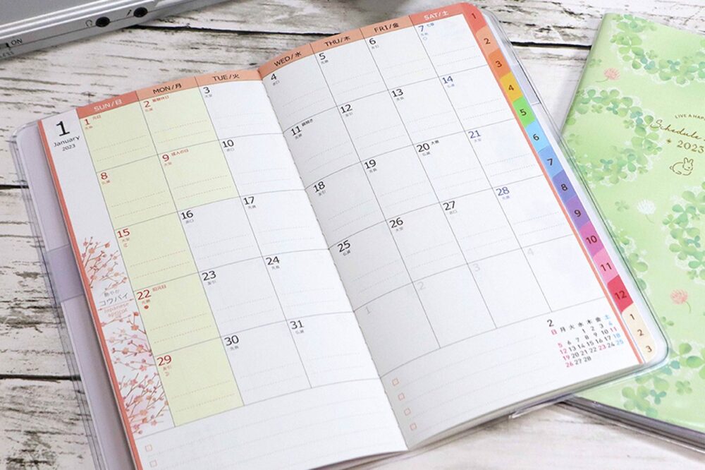 クツワ手帳は全てフルカラー印刷で見やすく、見たいページをサッと開けるインデックス付きで文具メーカーならではの強い機能面へのこだわりが、長く続く人気の秘密。またカラフルで綺麗な色使いは、明るい気持ちで1年間使うことができる。