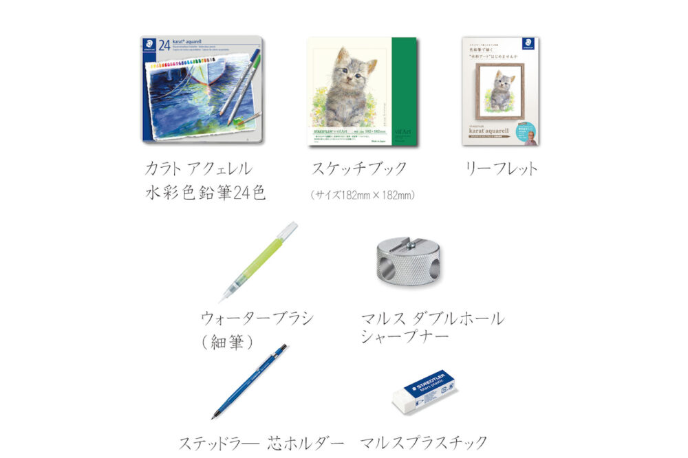 セット内容:カラト アクェレル 水彩色鉛筆24色、ウォーターブラシ(細筆)、ステッドラー 芯ホルダー、マルスダブルホールシャープナー、マルスプラスチック、野村先生描き下ろし作品「子猫」が表紙のマルマン社製水彩紙スケッチブック、背面位オリジナルロゴ入りで中身が見えやすい窓付きのクッションポーチ