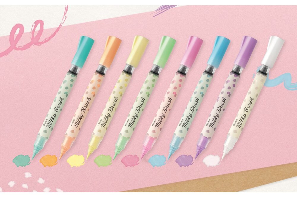 ぺんてるは、毛筆タイプのパステルインキ筆ペン「ミルキーブラッシュ」全8色を、9月20日(火)より、全国の文具取扱店にて順次発売開始。