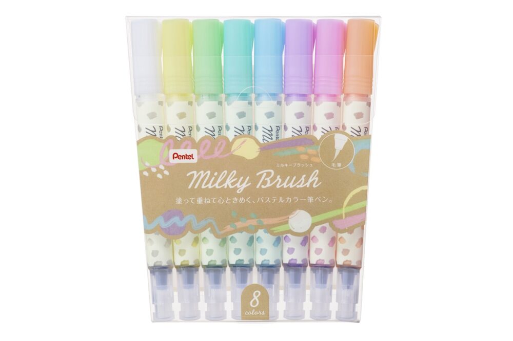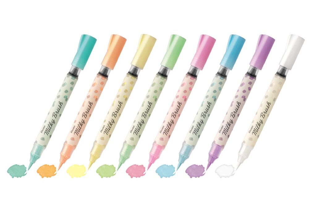カラーラインナップは、パステルミントグリーン、パステルオレンジ、パステルイエロー、パステルグリーン、パステルピンク、パステルブルー、パステルバイオレット、ホワイトの8色で、ミルキーらしいパステルカラーを揃えた。この筆ペンに最適化したインキ開発により、重ね塗りが可能となり、ミルキーブラッシュ同士や、他のペンとの組み合わせなど幅広い表現を楽しむことができる。