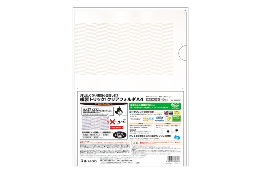 ヒサゴは、プラスチック不使用で紙資源としてリサイクルが可能な紙製フォルダに、のぞき見を防ぎつつ持ち主は中身が確認できる透かし模様「トリック!パターン」を施した「紙製トリック!クリアフォルダ」を9月20日(火)に発売。