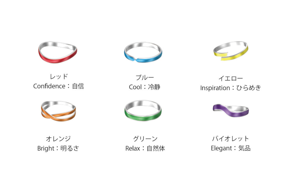 リングカラー:6色/レッド(自信)、ブルー(冷静)、イエロー(ひらめき)、オレンジ(明るさ)、グリーン(自然体)、バイオレット(気品)