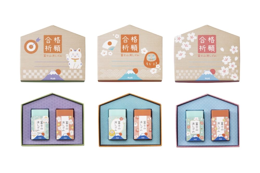 絵馬型のボックスは招き猫、だるま、さくらの3種類のモチーフと縁起の良い和柄をあしらった合格祈願にぴったりのデザイン。消しゴム本体の樹脂色は新色の「薄紅富士(うすべにふじ)」と「薄青富士(うすあおふじ)」の2色で、ケースのデザインは計6柄。2柄(2色)をセットにした小箱入りでの販売となる。ボックスには応援メッセージを書き込める大きめのメッセージ欄があり、プレゼントとしてはもちろん、受験生自身の願掛け用としても使用できる。