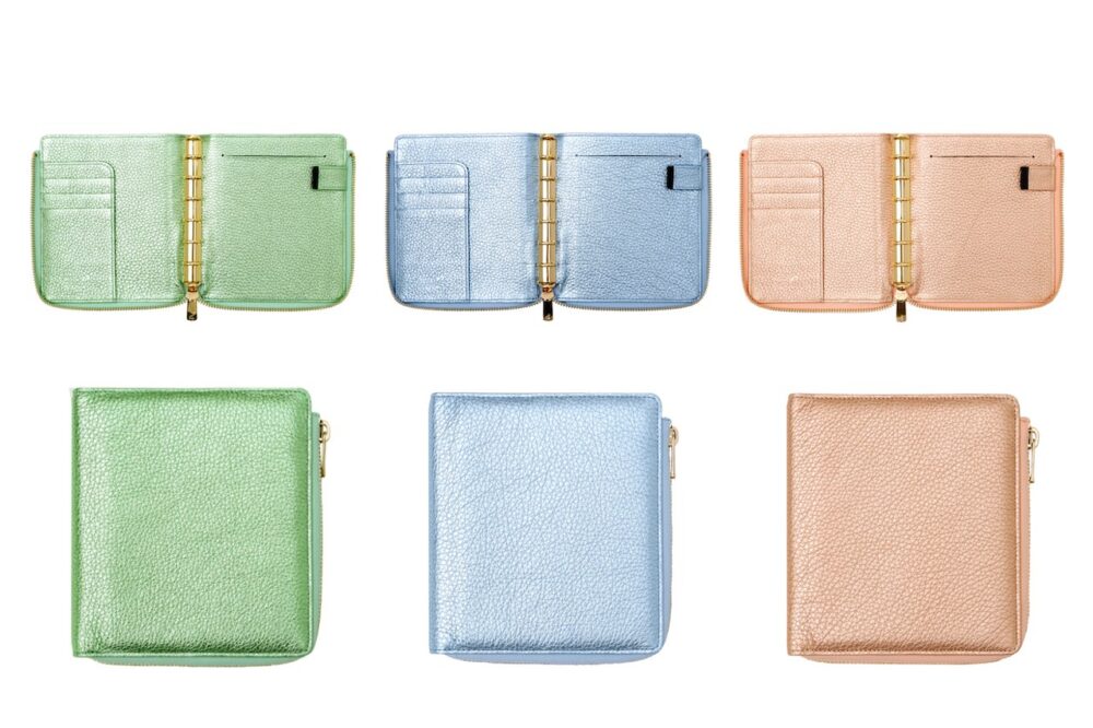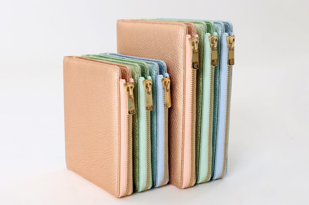今年の新作は、「スパークリングパステル」。シャイニーなメタリック加工、光の陰影を生み出すシボに、パステル調のカラーを組み合わた。他の本革モデルと同じくイタリア最大級のタンナー、マストロット社のレザーに、金具はゴールドのクラウゼ、ファスナーにはYKKのエクセラを組み合わせている。