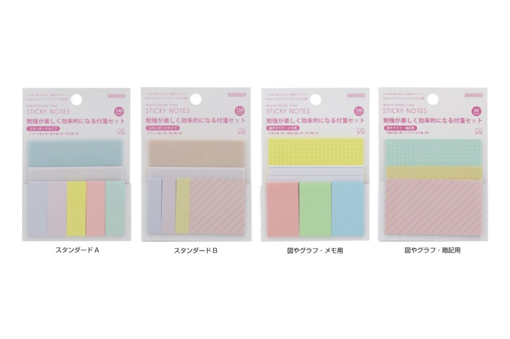 ファンから要望の多い半透明のグラシン紙や、図やグラフを描くなどのノート作りにも便利な付箋など、勉強効率にこだわった4種のセット。