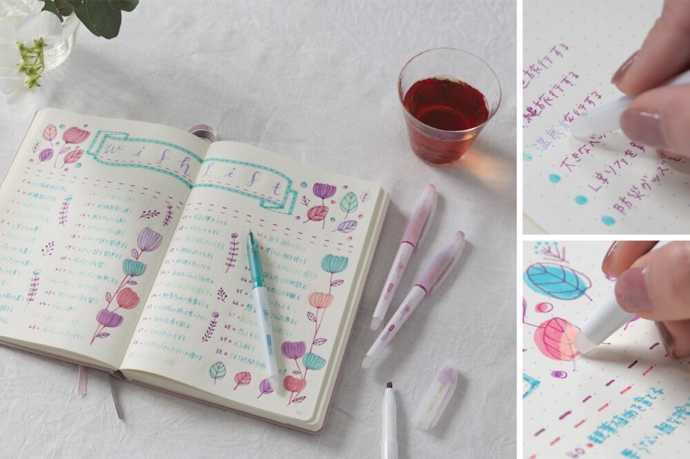 こすると紙面上のインキ色が変化するので、ノートや手帳などへの彩りをはじめ、自分の夢や願いを箇条書きにする「ウィッシュリスト」や仕事やプライベートの「To Doリスト」作りにも適している。