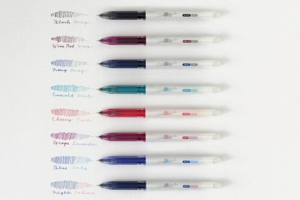 ペン後部の専用ラバーでこすると摩擦熱で筆跡の色を変化させることができるボールペン。インキ色は濃い色から薄い色へと変わる6色に、数量限定の2色を加えた計8色をラインアップした。