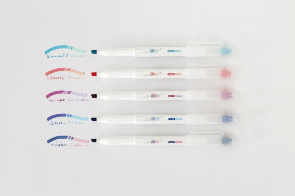 ペン後部の専用ラバーでこすると筆跡の色を変化させることができるマーカー。インキ色は同系色で濃い色から薄い色へと変わる3色と、数量限定の2色を加えた計5色をラインアップ。ノートや手帳へのデコレーションやマーキングはもちろん、色の変化で2色を楽しめるため紙面を華やかに彩ることができる。