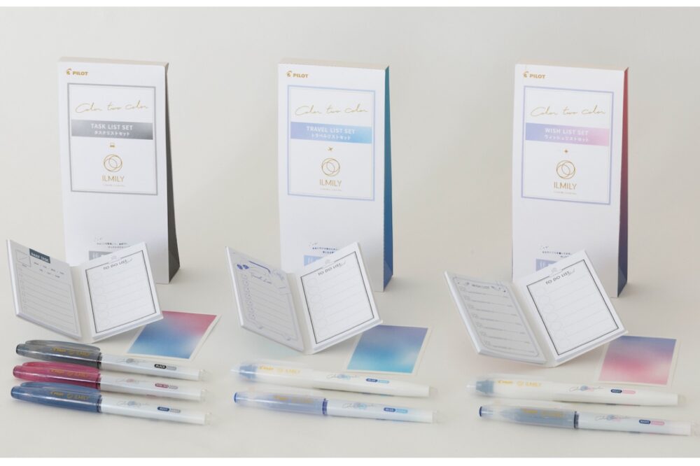 ウィッシュリストやTo Doリストを手軽に作ることができる専用のメモと、『ILMILY Color two color』シリーズの筆記具をセットにした6種類を数量限定で発売。ウィッシュリストやタスクリスト、これから読む本など、用途に応じたメモをセット。メモをノートや手帳に貼れるように、セットの筆記具の色に合わせたシールが付属されている。