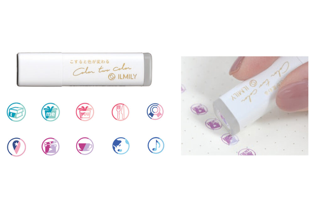 『ILMILY』の第3弾となる『ILMILY Color two color』は、“変わる、私のためのペン。”をコンセプトに、同社独自開発の温度で色が変化するインキの技術を活かした、こすると摩擦熱で筆跡の色が変わるボールペン、マーカー、押した柄の色が変わるスタンプを中心とした文房具シリーズ。