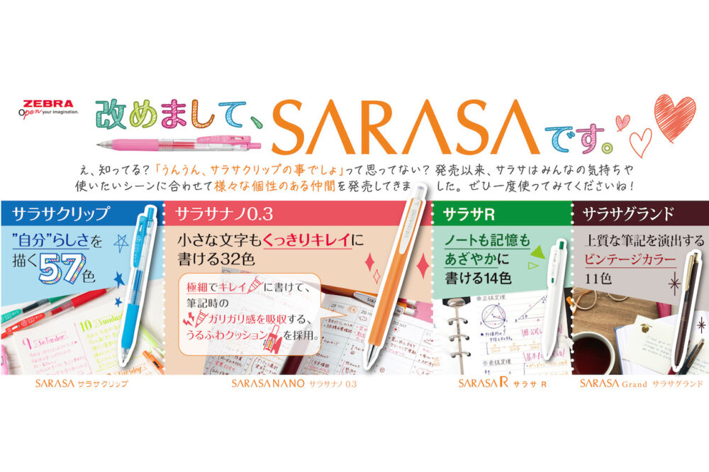 「サラサ」は2000年に発売を開始した、ジェルインクの特性を活かした鮮やかな発色と、さらさらとした書き心地が特長のボールペンシリーズ。代表的な商品「サラサクリップ」は、学生から社会人まで幅広く愛用され、ジェルボールペンの中でも10年連続売上No.1※1 を達成している。