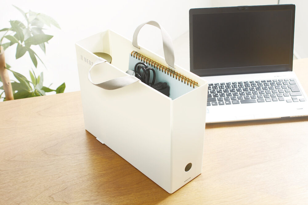 今回発売する「すっきり収納できるキャリーボックス<NEOS>」は、シンプルなファイルボックス形状でありながら、内部にワンタッチで開閉できる仕切りを設けた。これにより、水筒やACアダプター等の小物類もすっきりと整理して収容することが可能。また取っ手付きなので、家庭内やオフィス内でワークツールをひとまとめに持って移動する際に便利だ。