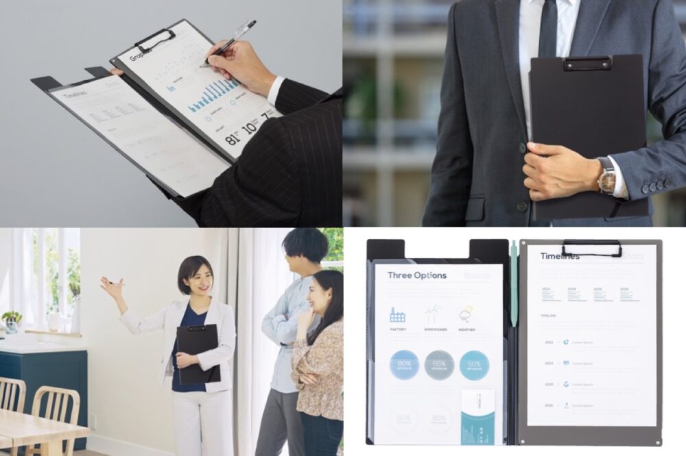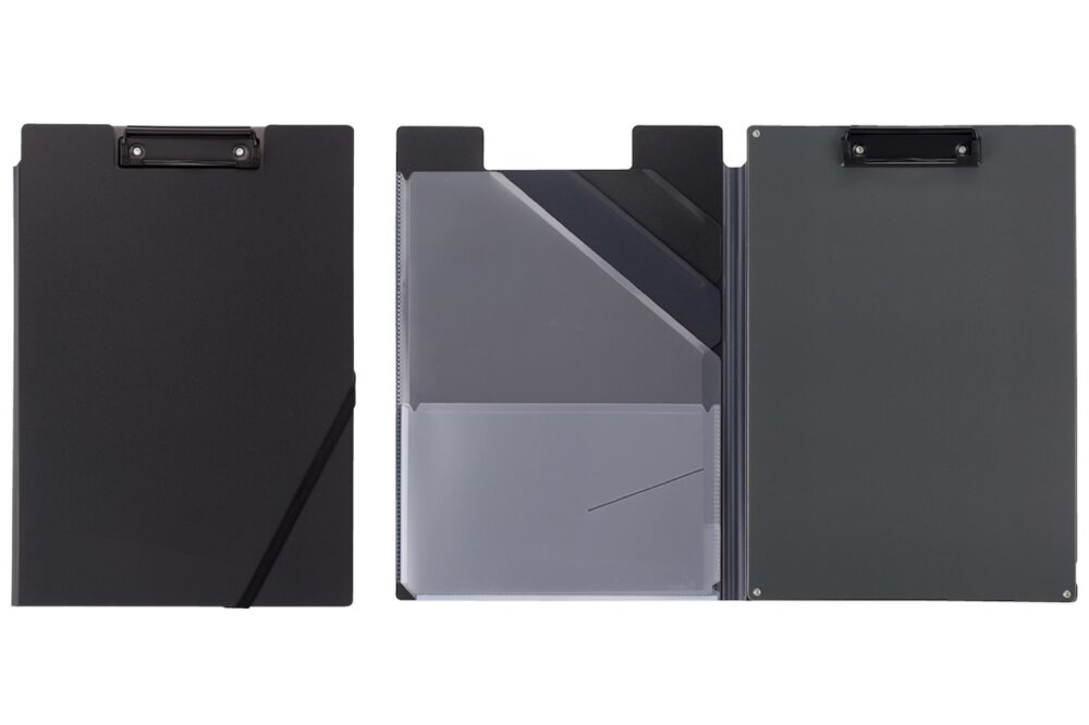 そこで今回、そのような声に応え、ビジネスシーンにも使いやすいブラックカラーをラインアップに追加した。“3段のインデックスポケットで分類しやすい“、”1枚目のインデックスポケットが透明で、左右に書類を並べて記入できる“、”厚めのボードで立ち作業でも書きやすい“などの好評な機能はそのままに、幅広いシーンで活用できるカラーを採用した。
