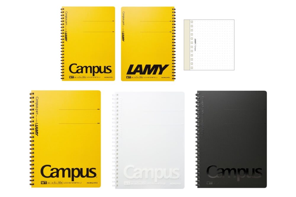 表紙は、表面に「Campus」ロゴ、裏面に「LAMY」ロゴをあしらった、コラボならではの特別感があるデザインとなっている。カラーバリエーションは、 LAMY safariを象徴するイエローと、シンプルなブラックとホワイトの3色。