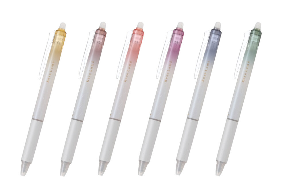 『KeseLamé』は、摩擦熱で筆跡を消去する「フリクション」シリーズで培った「消す技術」と、メタリックなどの特殊顔料インキの技術を組み合わせた消せるラメボールペン。ペン後部の消去用ラバーで擦ることでインキのベース色は摩擦熱によって無色になり、紙面に残るラメは擦り取られ、筆跡を消去することができる。