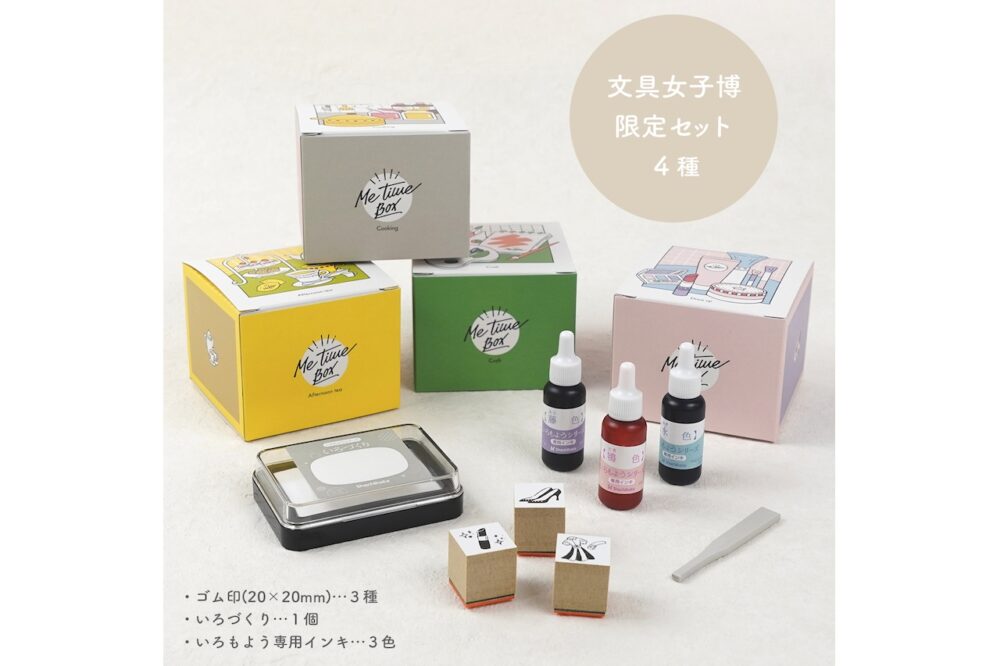 今回、文具女子博限定の4種類のいろづくりゴム印セット「Metime Box」を販売。ドレスアップ・アフタヌーンティ・クッキング・クラフトの4種類それぞれのテーマをイメージしたオリジナルボックスに、いろづくり1個、専用インキ3色、ゴム印3個が入った限定セットを1日あたり各50セットを用意した。