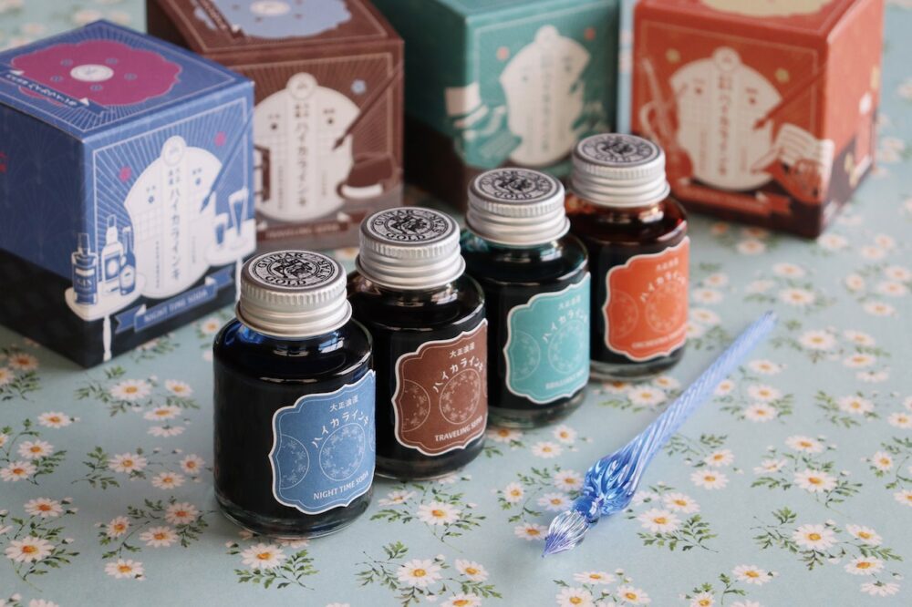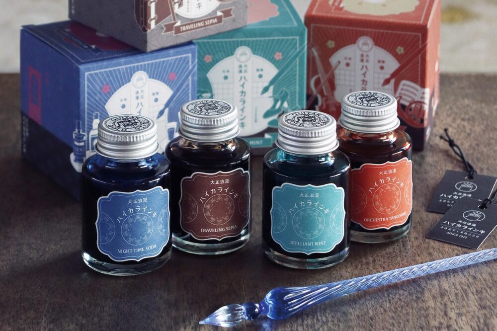 2021年に販売を開始以降、好評の万年筆インキ「ギター 大正浪漫ハイカラインキ」シリーズの第4弾・新色が登場! 大正浪漫を連想させるレトロな色合いが美しい「ナイトタイムソーダ」「トラベリングセピア」「ブリリアントミント」「オーケストラタンジェリン」の計4色が加わり、全16色のラインナップに。
