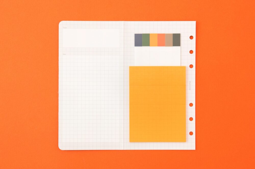日付やメモと同時に俯瞰できる貼付けボード付き付箋リフィル。バイブルサイズのカスタマイズバインダーと一緒に使うことができる。