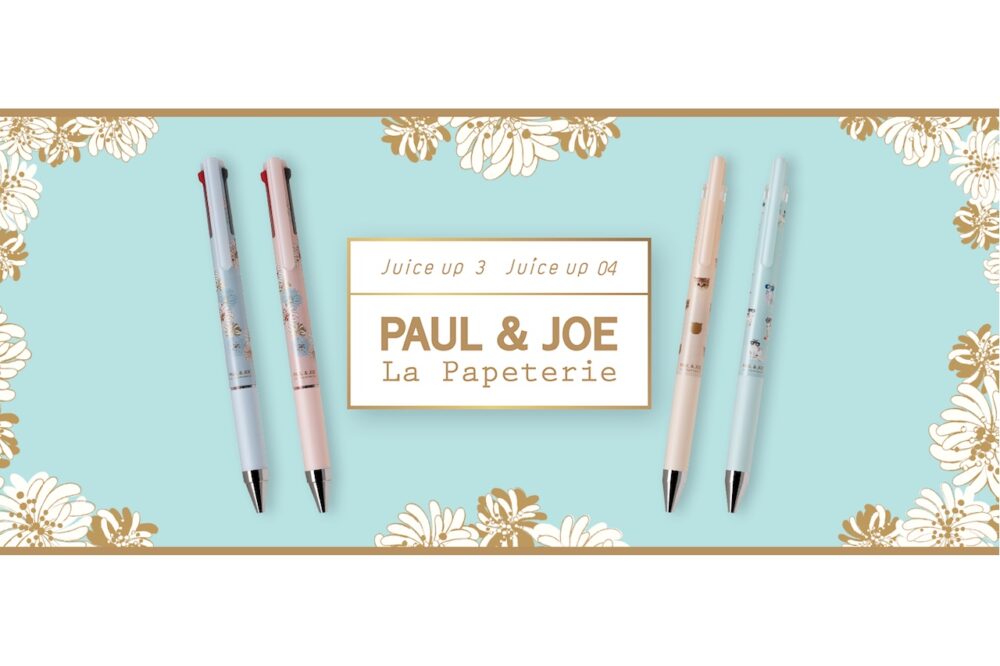 3色タイプのゲルインキボールペン『ジュースアップ3 PAUL & JOE La Papeterie コラボ』、ゲルインキボールペン『ジュースアップ PAUL & JOE La Papeterie コラボ』、 “水性ペンで書けるマスキングテープ”の『masté(マステ)® PAUL & JOE La Papeterie コラボ』の3アイテムを展開する。
