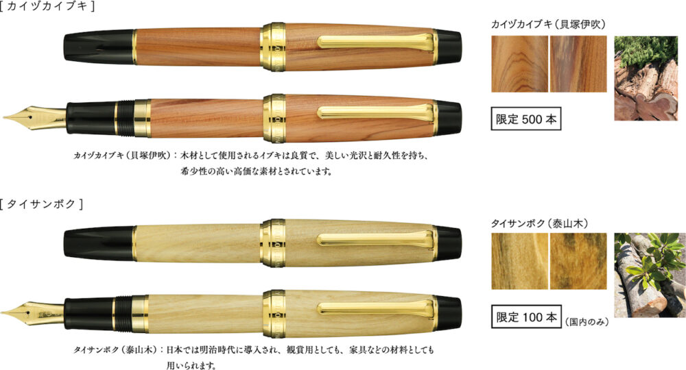 セーラー万年筆の創業地である広島県呉市の工場は再建され、2022年秋に竣工を迎えた。以前の工場棟は竣工から70年以上経過した建物もあり、敷地内の樹木とは長く歴史を共にしてきた。建替えに伴い伐採された敷地内の一部樹木を軸材に加工し、万年筆として生まれ変わらせた、新工場竣工を記念する製品となっている。1本1本違う木目で唯一無二の万年筆。広島県呉市の工場棟は、新しい建屋へ、工場敷地内の樹木は、万年筆へ。