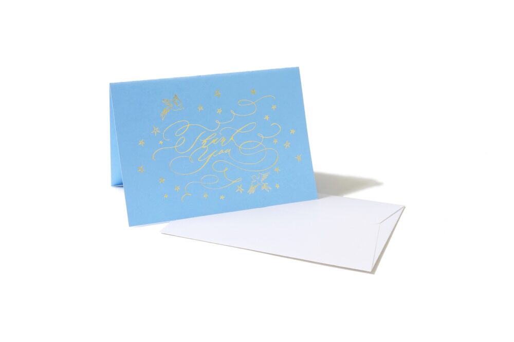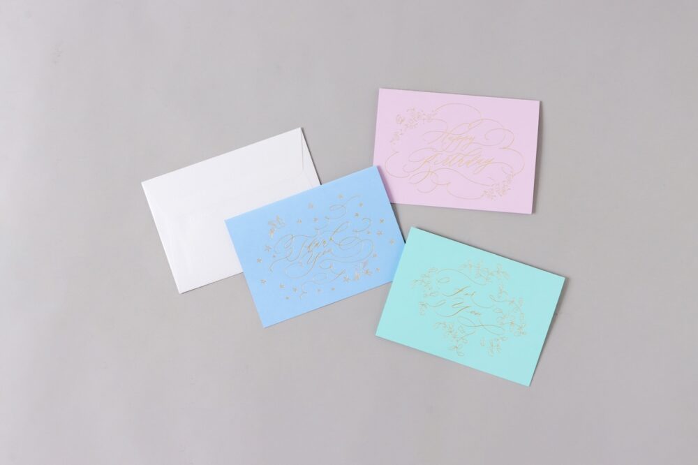 パステルカラーのカードにマットゴールドの箔押し加工。封筒はパールホワイトで優しい印象に。