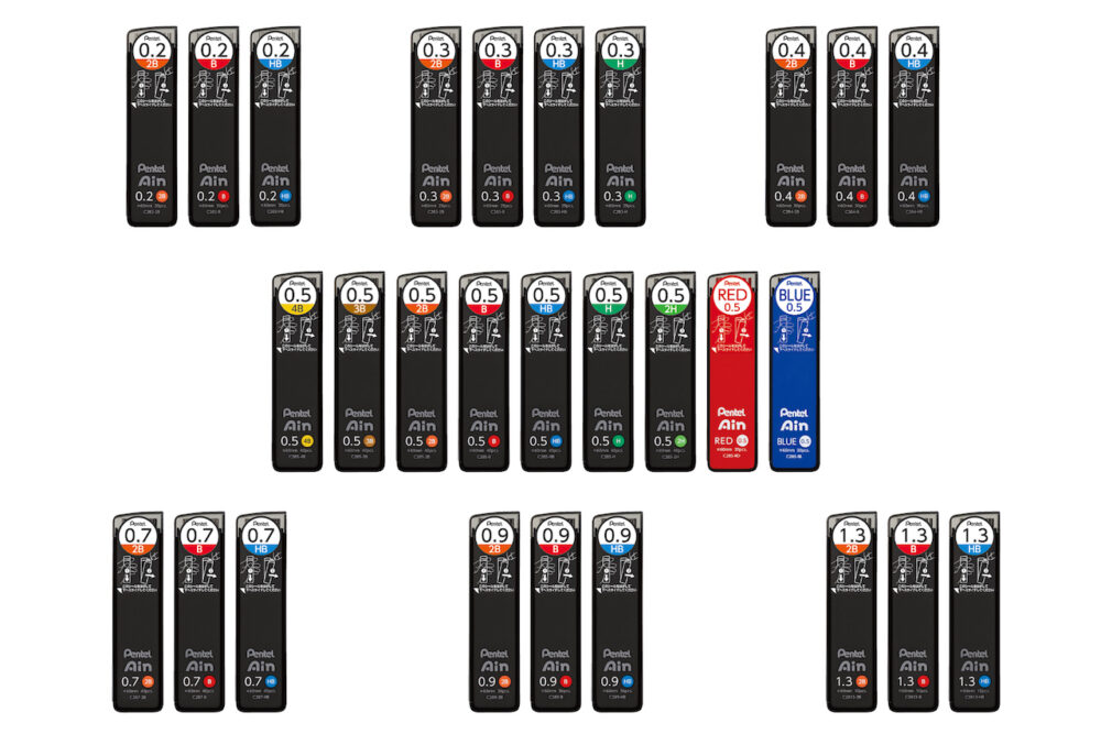また「Pentel Ain」では、「超極細芯」から「太芯」まで、どの芯径においても主要硬度(2B、B、HB)が選択できるようにラインアップしている。