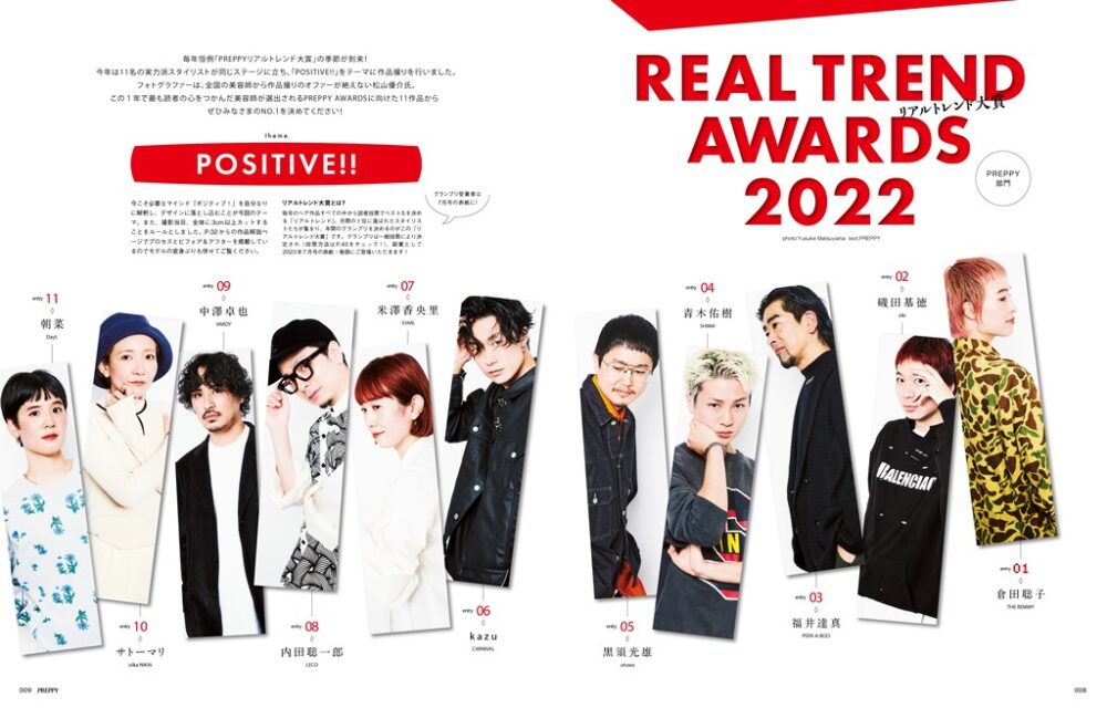 表紙&巻頭に「PREPPYリアルトレンド大賞2022」ノミネーター総勢11名が登場の、PREPPY2023年3月号。今年は11名の実力派ヘアスタイリストが同じステージに立ち、「POSITIVE!!」をテーマに作品撮りを行いました。フォトグラファーは、全国の美容師から作品撮りのオファーが絶えない松山優介氏。この1年で最も読者の心をつかんだ美容師が選出されるPREPPY AWARDSに向けた11作品から一般投票で年間NO.1(=グランプリ)が決まります。