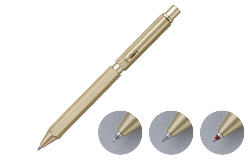 ロディアの筆記具コレクション「スクリプト」の多機能ペンは、ボールペン2色(ブラック・レッド)、メカニカルペンシルの3機能を搭載した3in1。回転して使用したい芯を繰り出す「ロータリー式」を採用。シリーズ共通のヘアライン加工されたアルミニウムの六角形軸としっくり手になじむほどよい重量感で、発売以来好評を得ている。