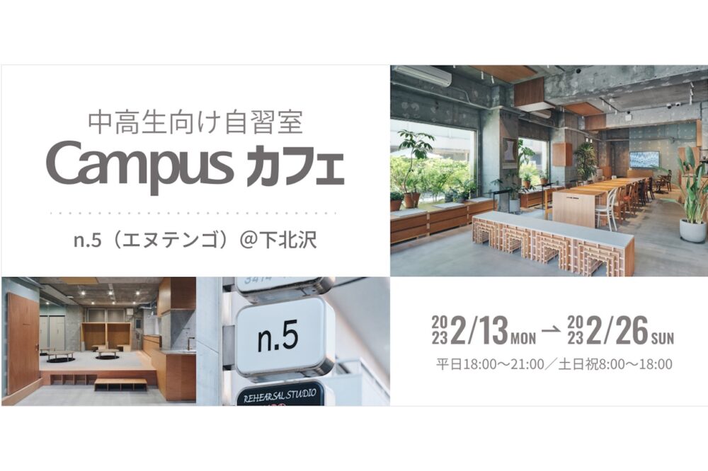 コクヨは、自ら学びに向かう中高生を支援する学習空間「自習室 Campusカフェ」を、2月13日(月)から26日(日)までの2週間、東京・世田谷区下北沢にてコクヨが運営する社員向け多目的スペース「n.5(エヌテンゴ)」にオープンする。またオープンに先駆け、2月6日(月)から利用予約の申し込みを受け付ける。