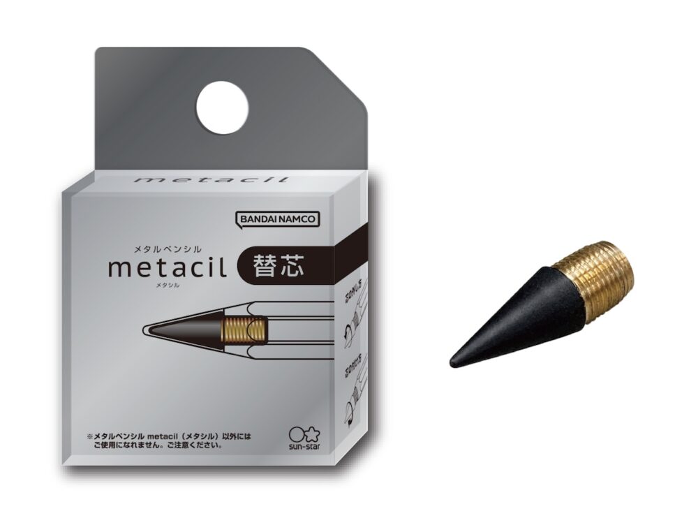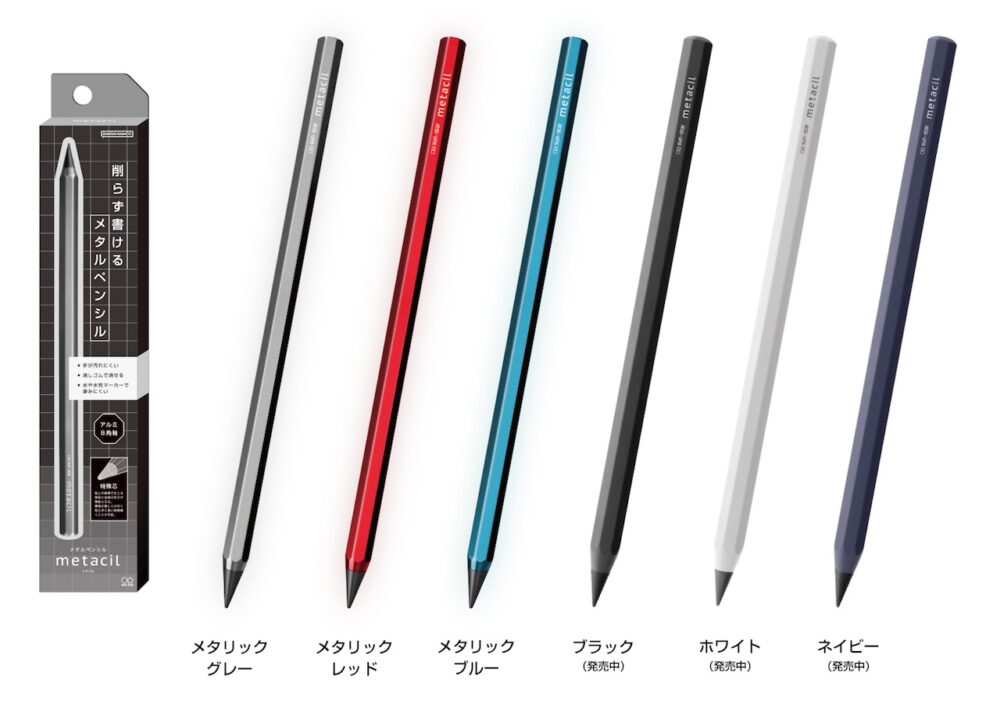 サンスター文具は、累計販売数25万本突破の、削らず書けるメタルペンシル『metacil(メタシル)』より、メタリックカラーの新色3色と要望の多い『metacil(メタシル) 替芯』を大手量販店・文具専門店・オンラインショップなどにて2月上旬より発売。