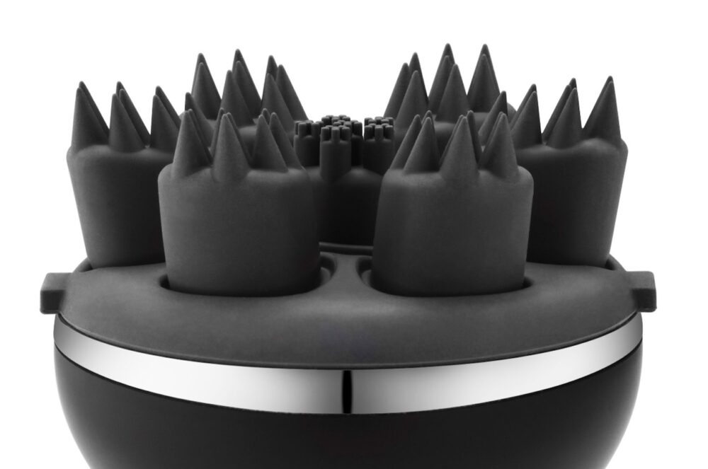 人間工学に基づいた3Dラウンドフォームを採用。ラウンド状に配置されたブラシがフィットし、360度あらゆる方向から刺激する。頭皮を包み込む構造で頭皮の筋肉をぐっとつかみ細かくもみ出し。安全機能も搭載しており、押し付けすぎによるオーバートリートメントを防ぐ。