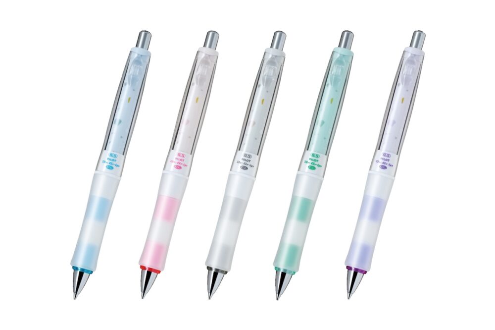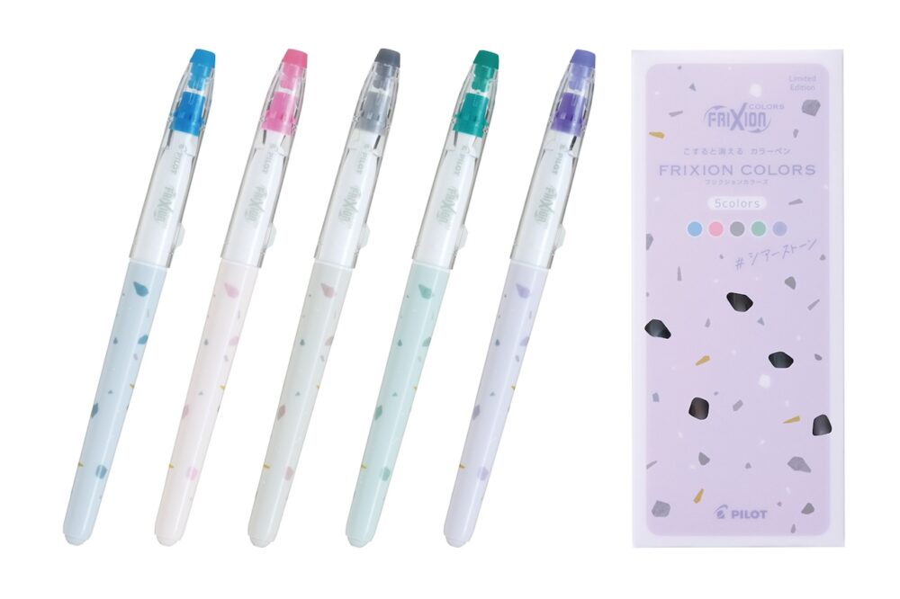 キャップの消去用ラバーでこすることで生じる摩擦熱で筆跡を無色にできる「フリクションインキ」のカラーペン。ボディの「シアーストーン」柄の色に合わせ、インキ色はスカイブルー、ベビーピンク、グレー、エメラルドグリーン、ラベンダーの5色。5色セットも同時発売する。