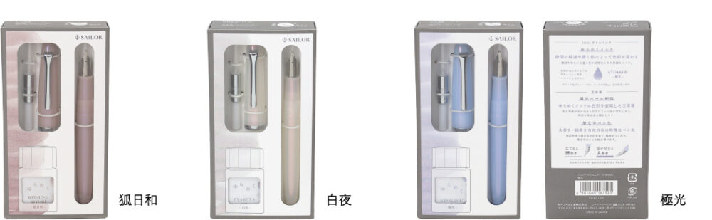万年筆はゆらめくインクの色彩を表現した偏光パール入り樹脂製で、見る角度や光の当たり具合によって色が変化したり、特定の色が見え隠れする。筆文字ペン先は太書き・細書き自由自在の特殊なペン先で、筆記角度の違いで線の太さが変わり、強弱がつくため筆文字のような線が書ける。