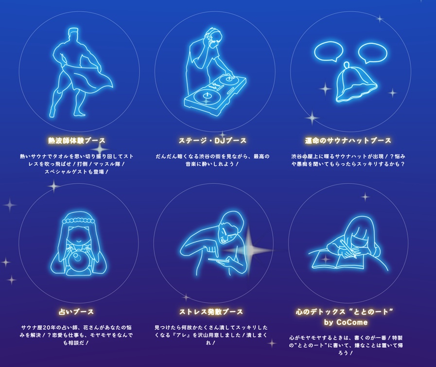 会場にはストレス・フリーが体験できる6つのブースをご用意。誰でも熱波師体験が可能な「熱波師体験ブース」、実力派DJが爽快な音楽で会場を盛り上げる「ステージ・DJブース」、身体を動かし爽快気分を味わえる「ストレス発散ブース」、悩みや課題を解決しストレス・フリーとなるきっかけを提供する「占いブース」や「運命のサウナハットブース」、「心のデトックス“ととのート”produced by CoCome」など、様々な体験を楽しむことができる。