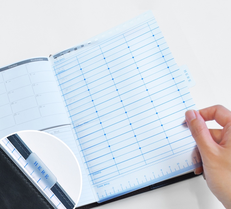 インデックスを下敷きの横に設けた。セパレートダイアリーの上段下段のページがバラバラになることなく開きたいページをサッと開くことができる。