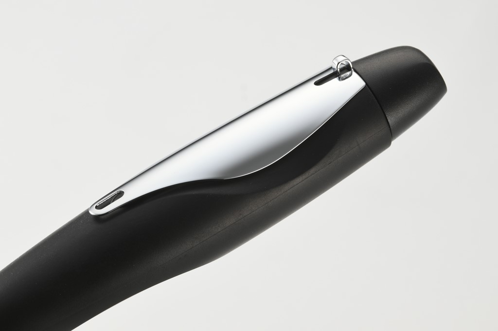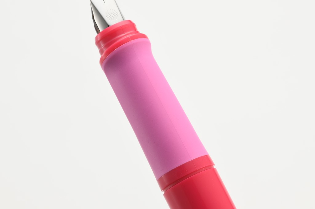 握りやすいラバーグリップが特徴の万年筆。直線的なフォルムに流線的なクリップを組み合わせたシンプルなデザインがグッド。写真のピンクは新色で、スチールペン先でありながら、軟調設計になっている。ターコイズとブルーもあり、こちらも軟調のペン先を搭載。