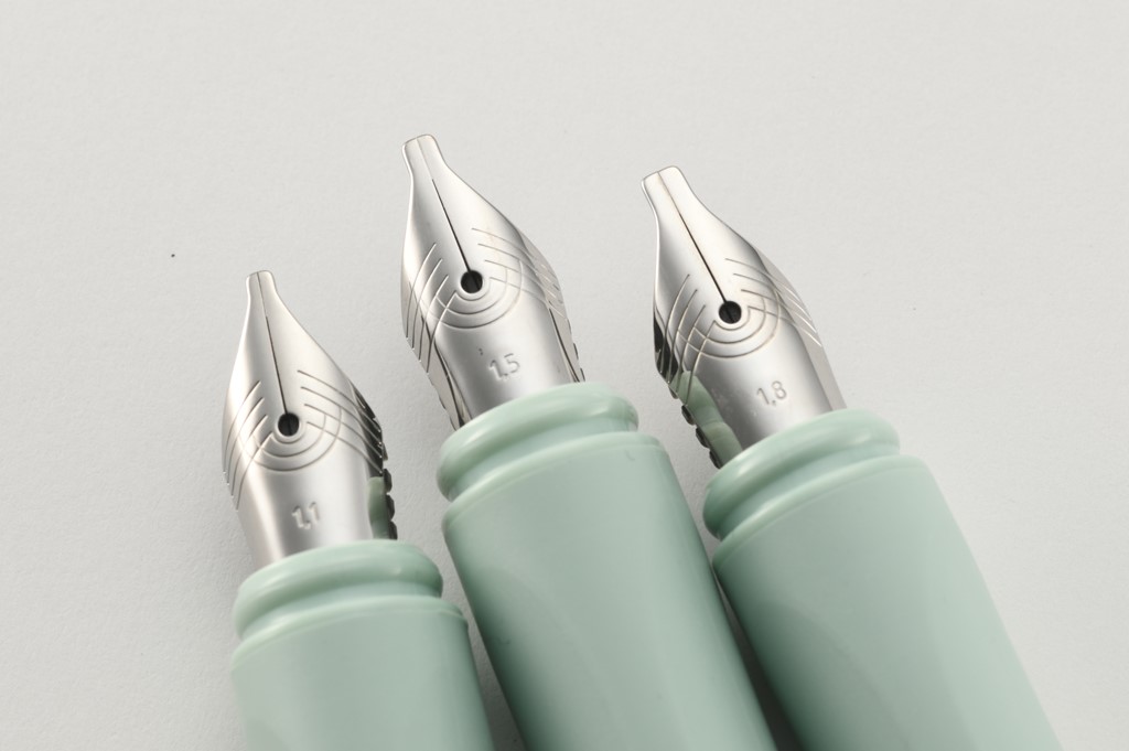 3種類のカリグラフィーペン先とパステルのインクカートリッジ「バミューダ―ブルー」がセットになったコスパ抜群のセット。写真は人気カラーの「ミント」。その他にオレンジ色の「アプリコット」とシルバー色の新色「アンスラサイト」がある。入門者にもおすすめの逸品。