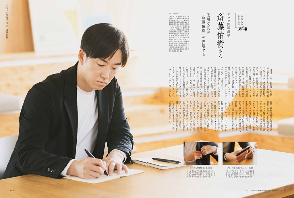 数ある文具の中で愛用品になる所以は十人十色です。それは機能性やデザイン性に惚れ込んだり、もの作りの背景に感銘を受けたり、はたまた、大切な人から譲り受けたものだから——。実用的な側面と嗜好的な側面の両面を持つ文具は、自分自身のスタイルが確立していれば、自然と暮らしに寄り添う必要不可欠な愛用品となっています。今回の特集では「宇宙兄弟」の漫画家・小山宙哉さん、フリーアナウンサー・宇垣美里さん、元プロ野球選手・斎藤佑樹さん、「マチネの終わりに」の小説家・平野啓一郎さんなど、各界で活躍する人たちのルーツやスタイルを紐解きながら愛用している文具を紹介しています。
