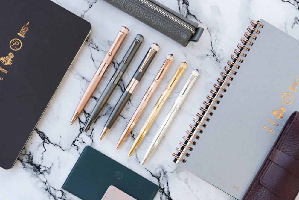 時計の⻯頭をモチーフにした天冠には「⼤切な時間をこの筆記具と共に過ごしてほしい」という想いが込められている。ビジネスシーンでノートをとる時、ひらめいたアイディアを書き留める時、⽇記や⼿紙を書く時・・・⼤切な時間がROMEOと共に始まる。
