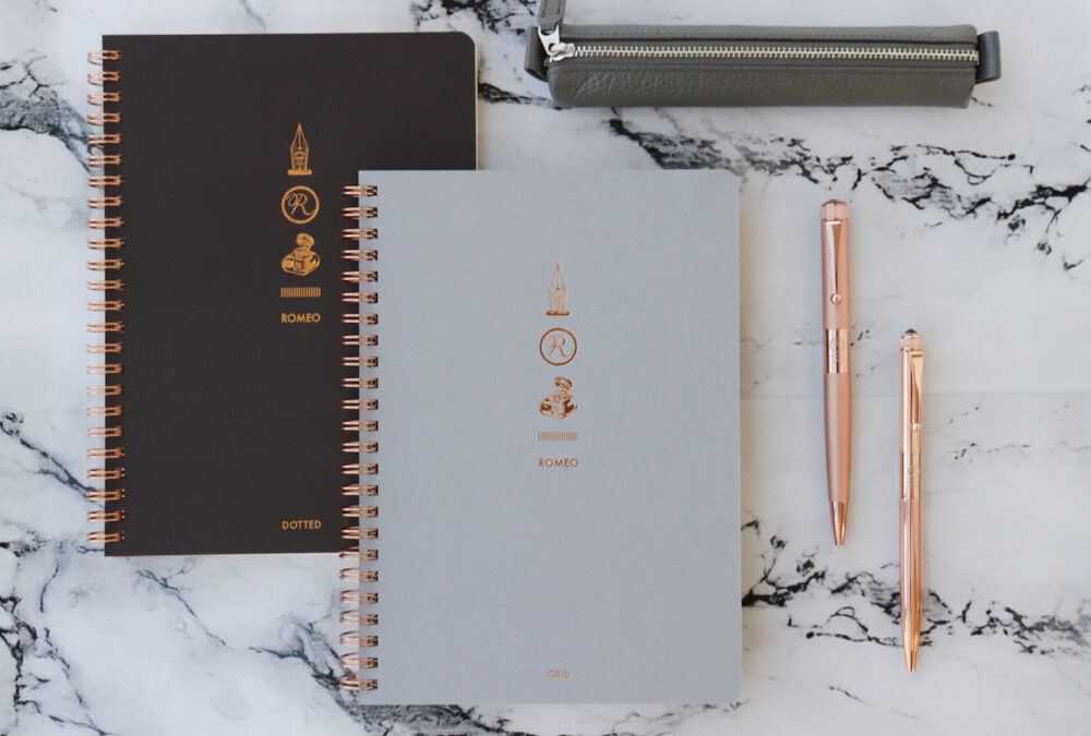 実⽤性と機能美を兼ね備えたROMEO No.3ボールペンの書き⼼地をさらに引き⽴たせるのは、本⾰をイメージした⾼級感のある表紙にカッパーカラーのリングと精緻な箔プリントが上品な輝きを放つ「ROMEO Wリングノート」。