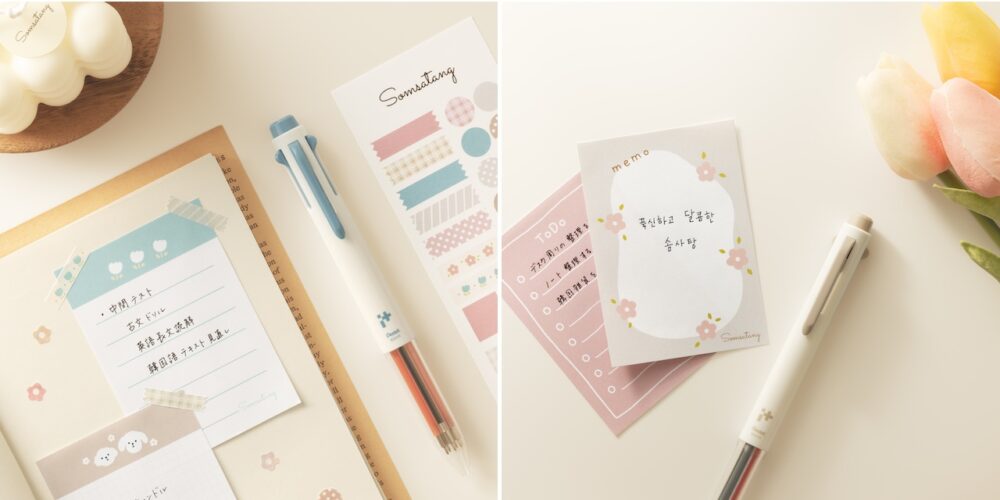 5本用ボディセットにはシールとメモが、3本用ボディセットにはメモがセット。「アイプラス シンプルコーデ」の淡いボディカラーに合わせたSomsatangオリジナルデザインのアイテムを一緒に使えば、いつもの手帳やデスク周りを淡色コーデにアップデートできる。