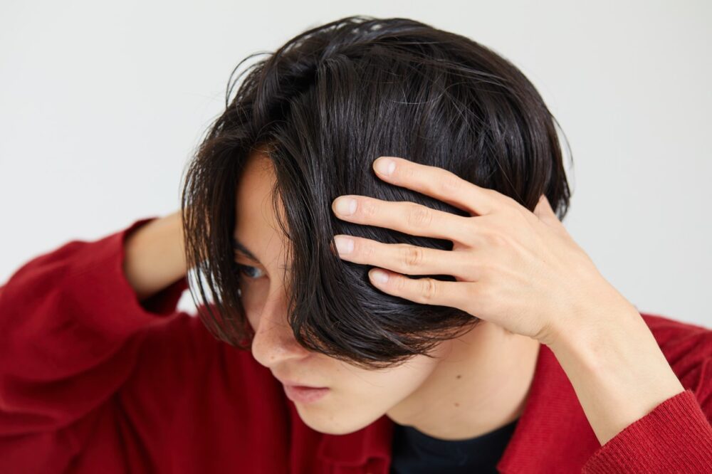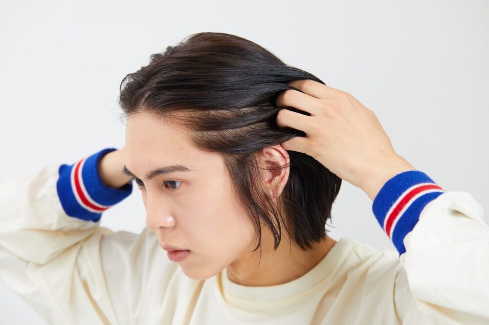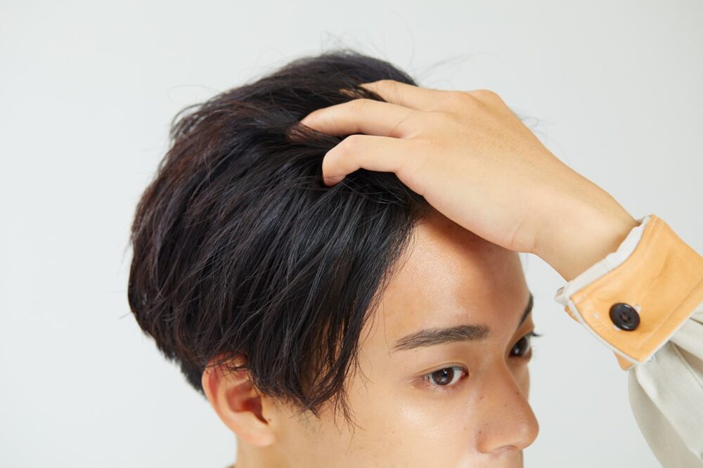 柔らかめのクリームワックス、もしくはバームを手のひら全体に広げ、フロントからかき上げるように塗布する。全体になじませたら、毛先を自然に散らして仕上げる。