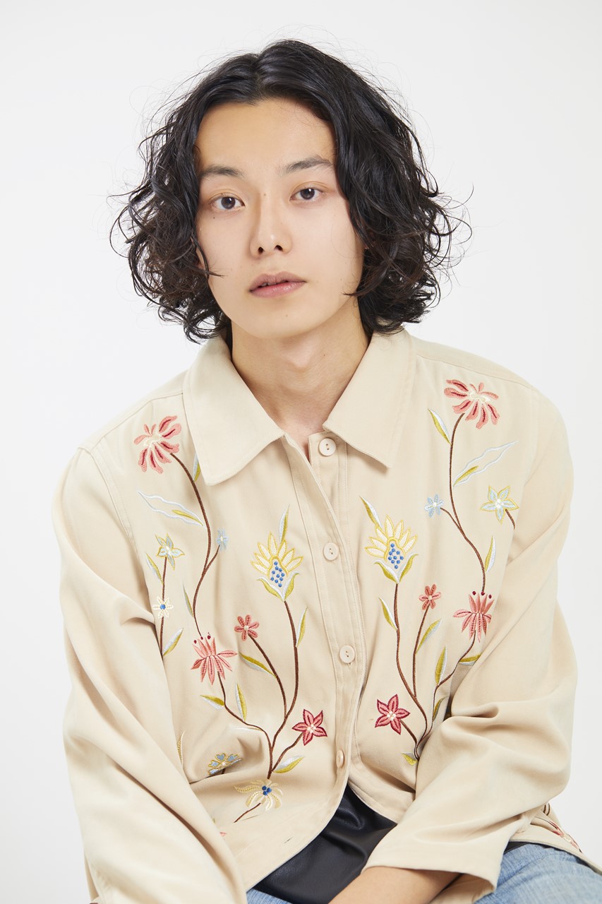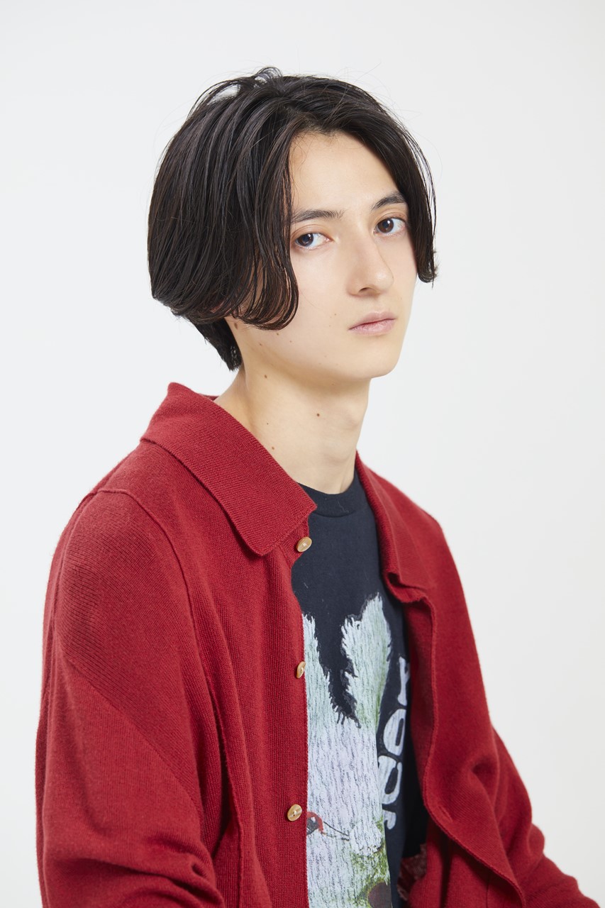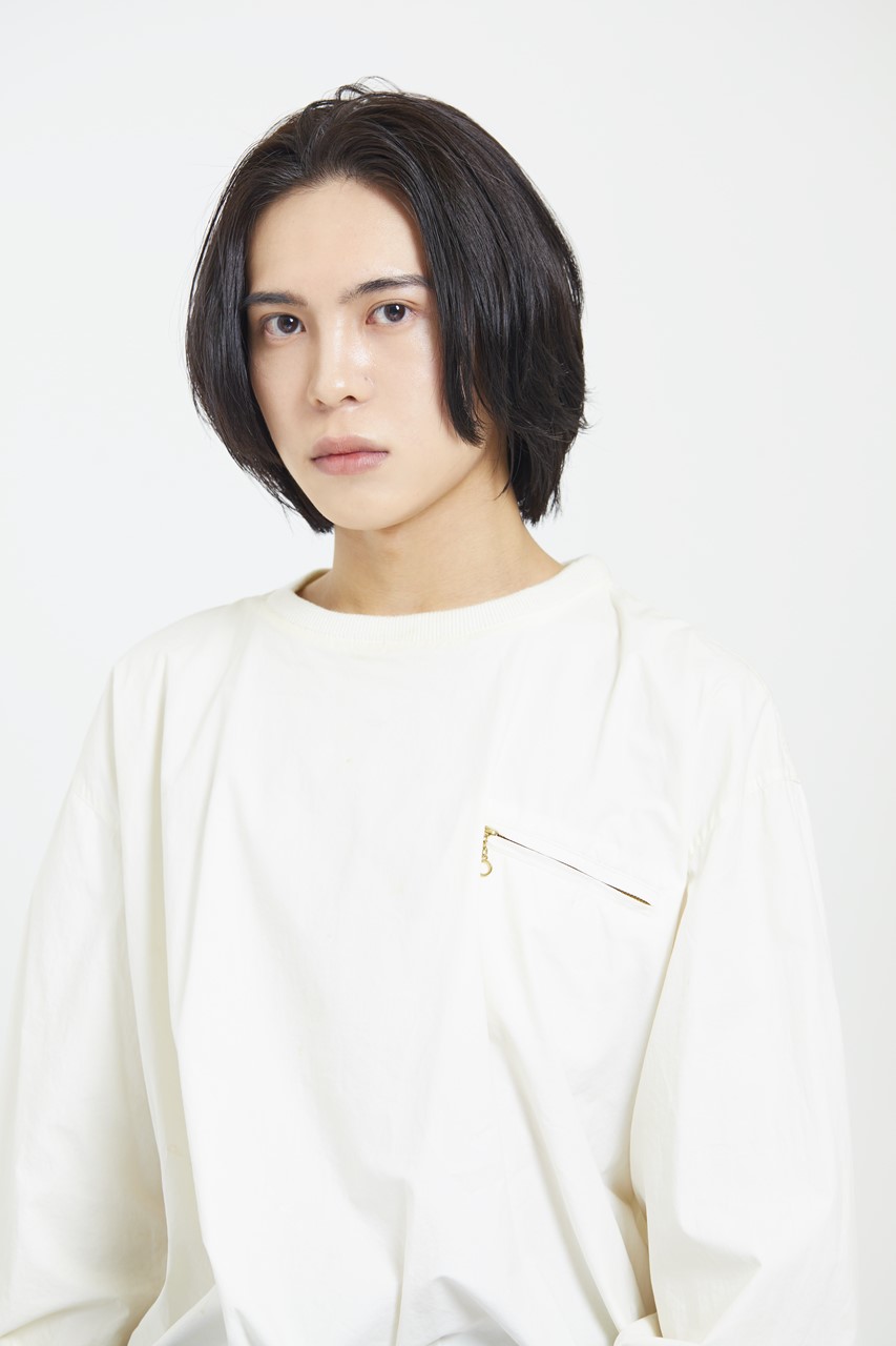 カット/ボブベース。表面のみレイヤーを入れて動きを出す。量感はセニングで少し取る。中性的な雰囲気のレングスに、もともとのクセ毛を生かして柔らかい雰囲気に。カラー・パーマ/なし。
