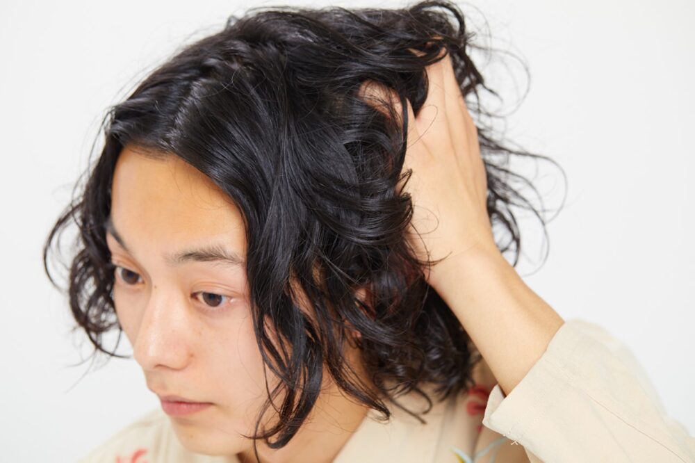 全体にオイルをなじませ、オールバックにしてからセンターで分け下ろす。顔まわりは前方へ押し出すようにしてパーマの動きを作る。