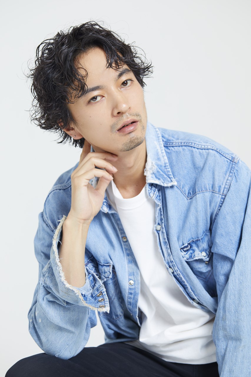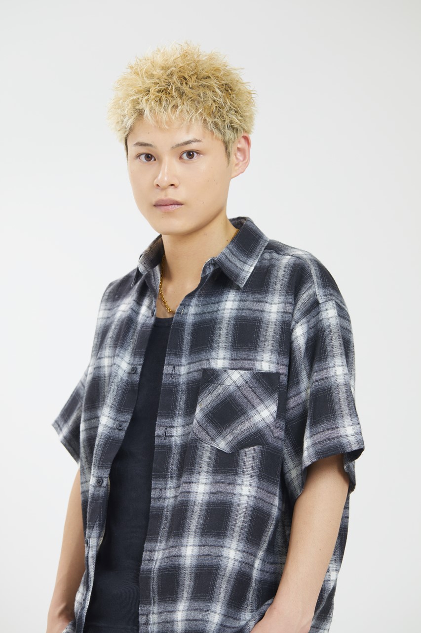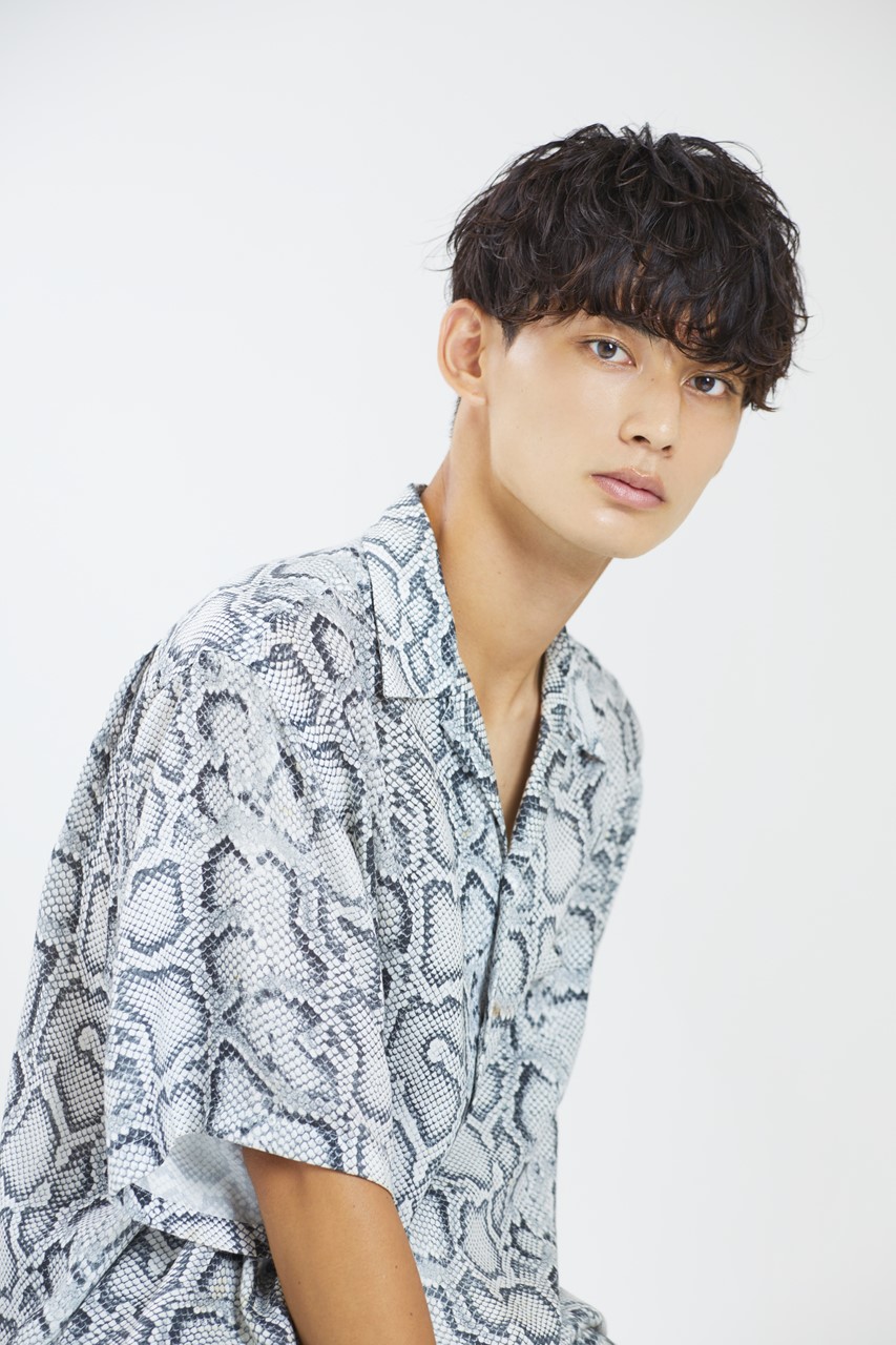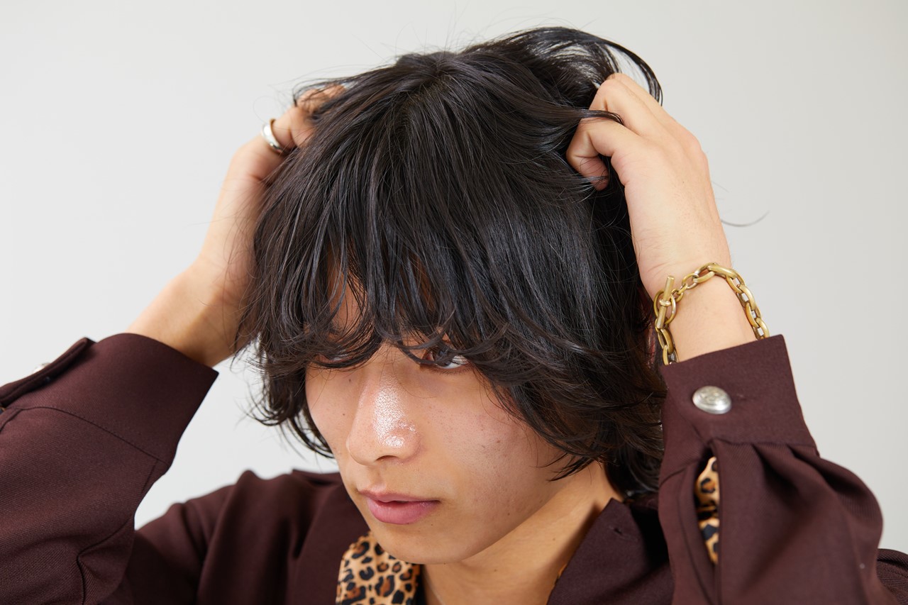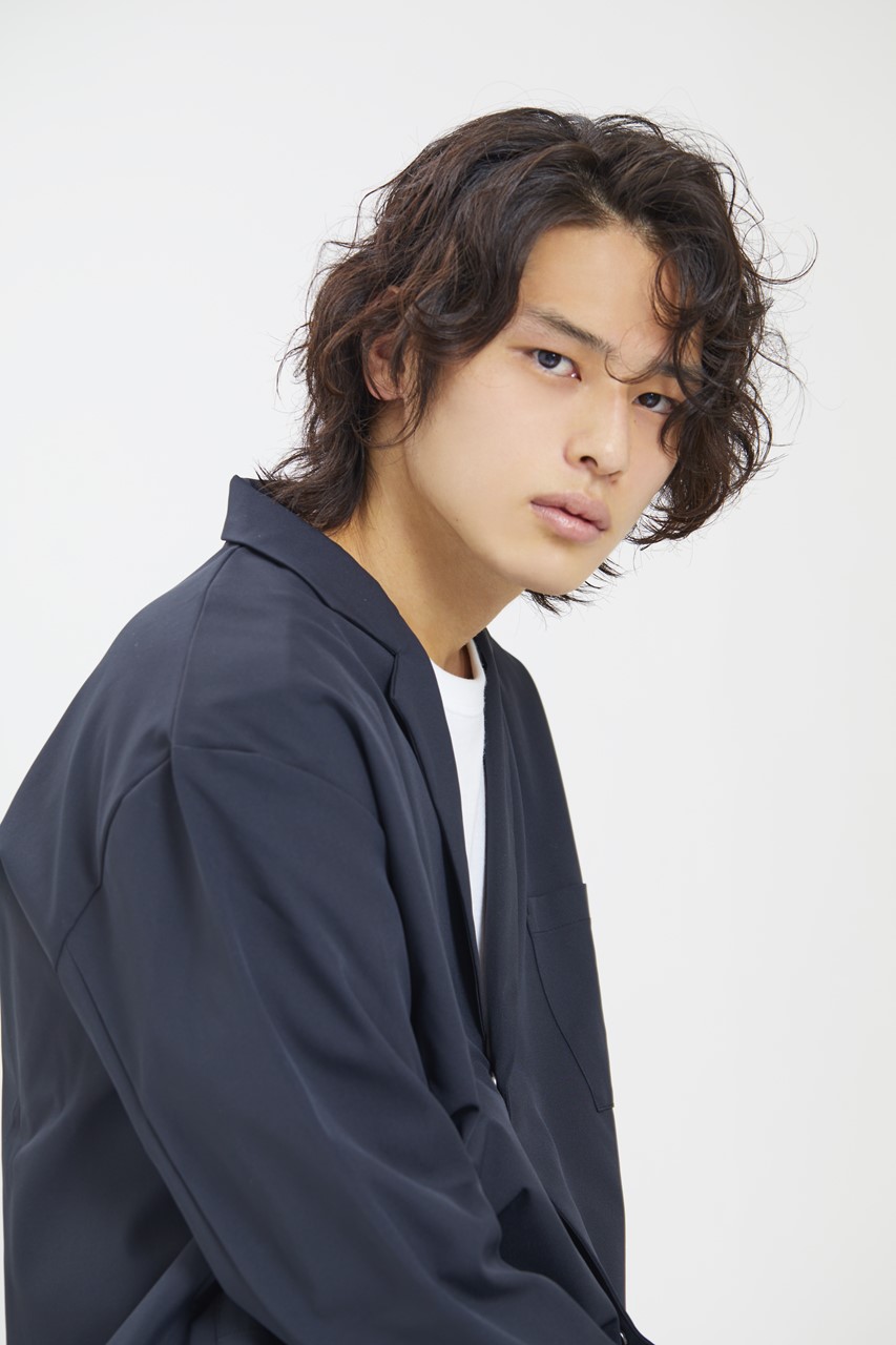 カット/マッシュベース。アンダーを刈上げてツーブロックに。トップは長く残すことで、正面から見たときにパーマがより重なって動く。毛量は毛先のみ軽く調整する。カラー/なし。パーマ/14mmのロッドをメインに3回転ねじりのツイストスパイラルパーマをかける。目にかかる毛束もしっかり動かすのがポイント。