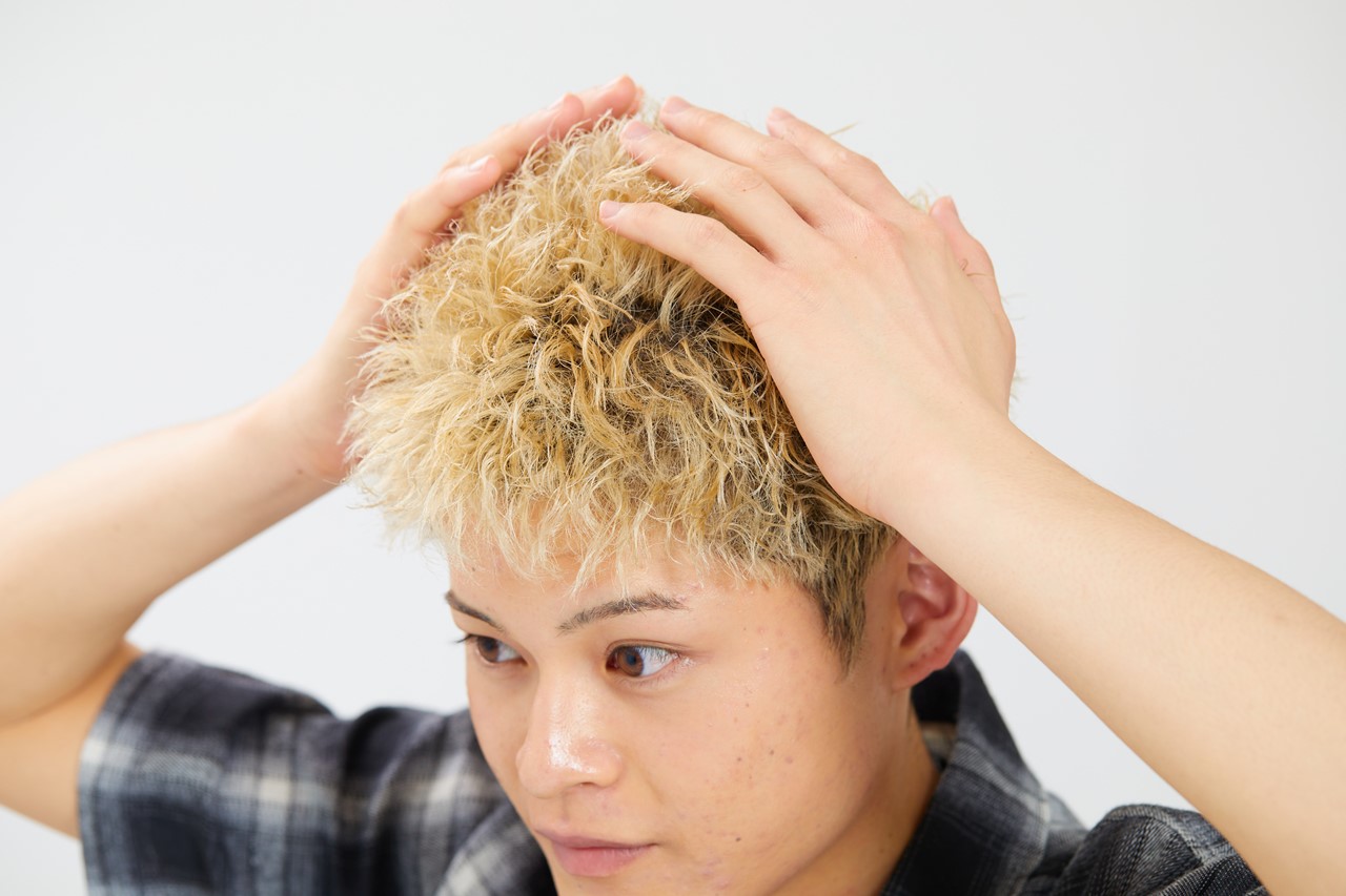 カット/ショートレイヤーベース。毛量は多めに残すとパーマのリッジがキレイに出る。カラー/ブリーチ(1~2回)で15~17トーンまでリフトアップしたら、黄ばみを取る程度にホワイトブロンドをオン。パーマ/毛束をねじってツイストパーマをかける。短髪でもリッジ感のあるカールが出る。